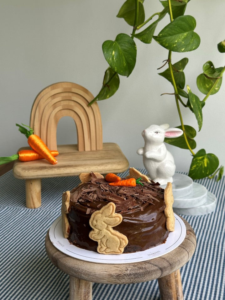 Mini torta de chocolate con fudge, decorada con motivos de pascua.